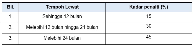 Sekiranya pembayar cukai lewat mengemukakan BN, pengenaan penalti di bawah subseksyen 112(3) ACP 1967 adalah berdasarkan tempoh kelewatan selepas tarikh akhir pengemukaan BN seperti yang berikut: