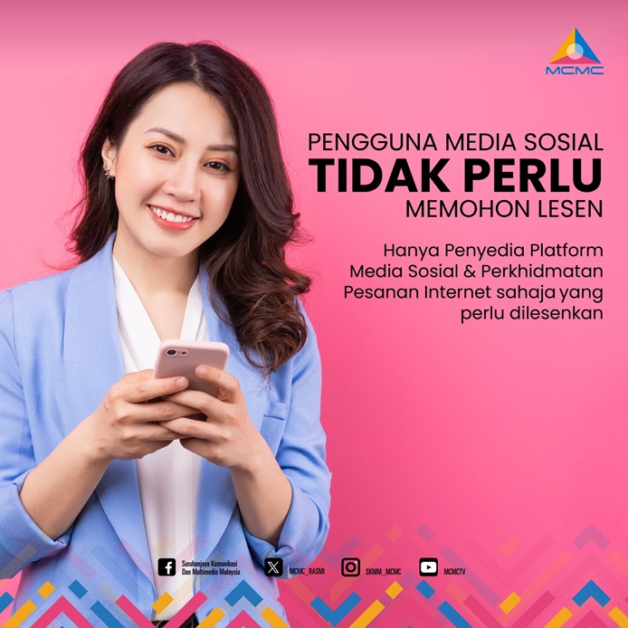 Pengguna Media Sosial tidak perlu memohon lesen CYBERJAYA, 16 Dis (Bernama) -- Pelesenan platform media sosial yang bakal berkuat kuasa pada 1 Januari tahun depan HANYA memerlukan penyedia perkhidmatan pesanan Internet dan media sosial dengan sekurang-kurangnya 8 juta pengguna di Malaysia untuk dilesenkan di bawah Akta Komunikasi dan Multimedia 1998.