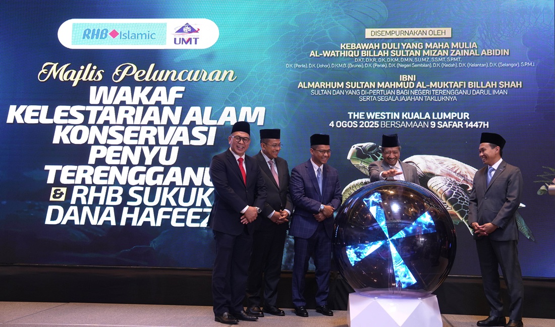 [Dari kiri ke kanan] Dato’ Seri Ir. Dr. Ahmad Samsuri bin Mokhtar, Menteri Besar Terengganu; Prof. Ir. Ts. Dr. Mohd Zamri bin Ibrahim, Naib Canselor Universiti Malaysia Terengganu; Dato’ Adissadikin bin Ali, Pengarah Urusan/Ketua Pegawai Eksekutif, RHB Islamic Bank Berhad; KDYMM Al-Wathiqu Billah Sultan Mizan Zainal Abidin Ibni Almarhum Sultan Mahmud Al-Muktafi Billah Shah, Sultan Terengganu; dan Encik Mohd Najman bin Md Isa, Ketua Pegawai Eksekutif/Ketua Pegawai Pelaburan RHB Islamic International Asset Management Berhad di Majlis Peluncuran Wakaf Kelestarian Alam: Konservasi Penyu Terengganu dan RHB Sukuk Dana Hafeez.