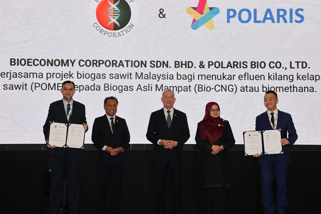 (Centre) Deputy Prime Minister and Minister of Energy Transition and Water Transformation, YAB Dato’ Sri Haji Fadillah Yusof witnessed the exchange of memorandum of understanding between (far left) Chief Executive Officer of Bioeconomy Corporation, En. Mohd Khairul Fidzal Abdul Razak and (far right) Polaris Bio’s Chief Executive Officer, Mr. Junghwan Kim at the opening ceremony of the National Innovation and Creative Economy Expo 2025 (NICE 2025) at the World Trade Centre Kuala Lumpur on 6 October 2025. They were joined by (second from left) Deputy Minister of Science, Technology and Innovation, Dato' Haji Mohammad Yusof Bin Apdal and (second from right) Deputy Secretary General (Technology Development) of the Ministry of Science, Technology and Innovation, Puan Norsham binti Abdul Latip.Malaysia-South Korea to expand biogas innovation and accelerate decarbonisation with plans for nationwide initiativesKUALA LUMPUR, Oct 6 (Bernama) -- Malaysian Bioeconomy Development Corporation (Bioeconomy Corporation), under the purview of the Ministry of Science, Technology and Innovation Malaysia, has entered into a collaboration with South Korea-based renewable energy company Polaris Bio Co., Ltd. (Polaris Bio) to develop palm oil mill effluent (POME)-based biogas upgrading facilities in Malaysia as part of renewable energy investments.