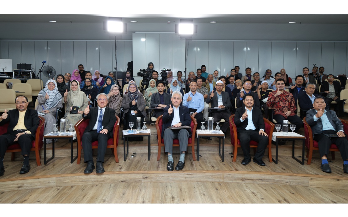 Felow Kehormat IKIM, Tan Sri Azman Mokhtar (tengah); Ketua Pengarah IKIM, Prof. Madya Dato’ Dr. Mohamed Azam Mohamed Adil (dua dari kiri); bersama para pembentang dan peserta seminar di UTM Kuala Lumpur.