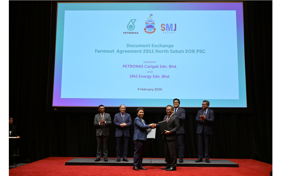 KUALA LUMPUR, Feb 10 (Bernama) -- PETRONAS Carigali Sdn. Bhd. (PETRONAS Carigali), a whollyowned subsidiary of PETRONAS, has signed a Farm Out Agreement (FOA) with SMJ Energy Sdn. Bhd. (SMJE), a company wholly-owned by the Sabah State Government for the assignment and transfer of PCSB’s 20 per cent (20%) non-operating participating interest to SMJE in the 2011 North Sabah Enhanced Oil Recovery Production Sharing Contract (2011 NSEOR PSC).