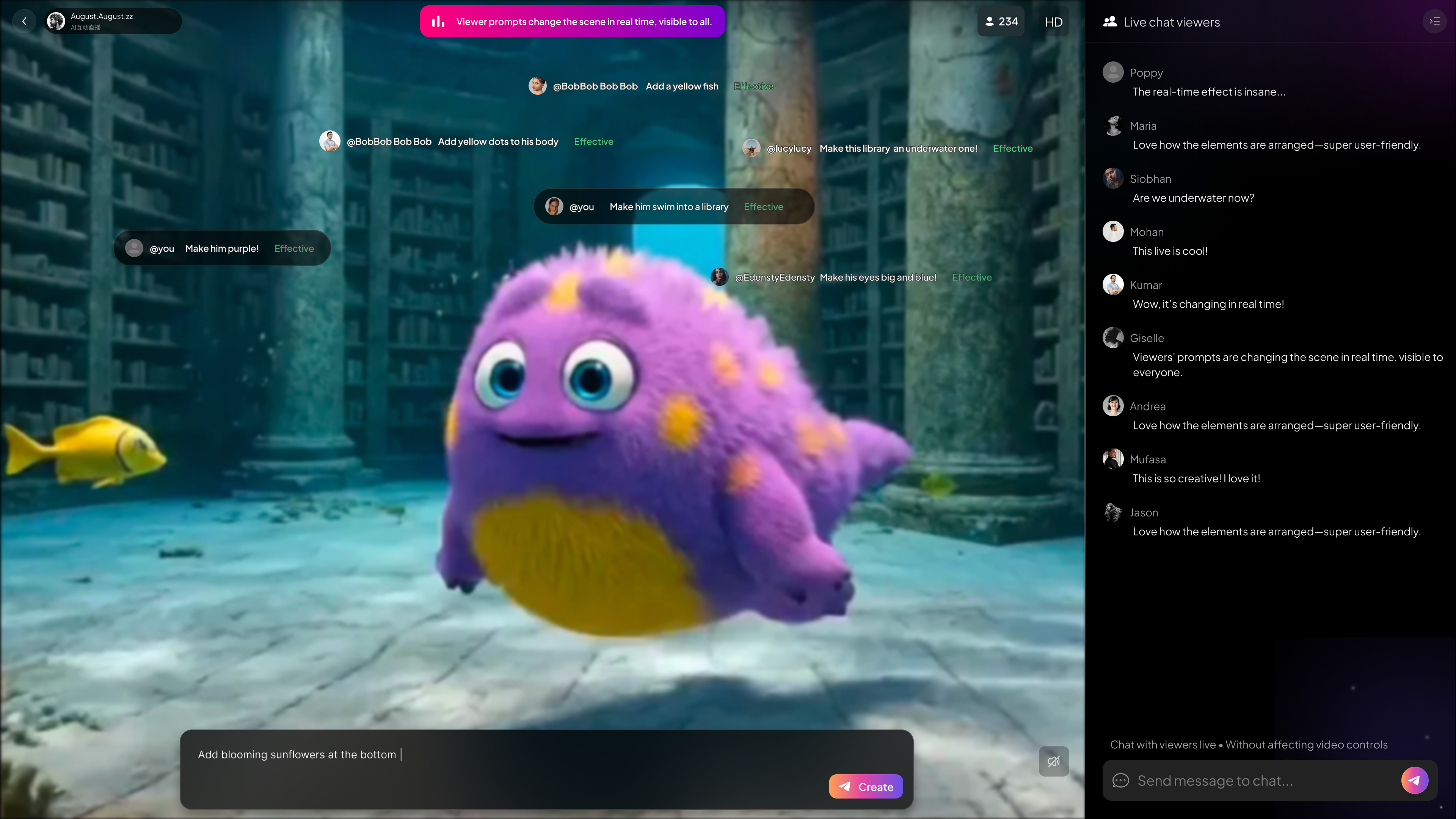 R1 now supports multi-user participation through a continuous shared livestream. Users submit prompts into a common live feed, each prompt visible to all participants as it scrolls across the screen. When the AI picks up a prompt, it is instantly realized as video within the shared environment, accompanied by real-time visual effects. A live chat layer enables users to interact alongside the evolving stream, creating a dynamic feedback loop between participants and generation.