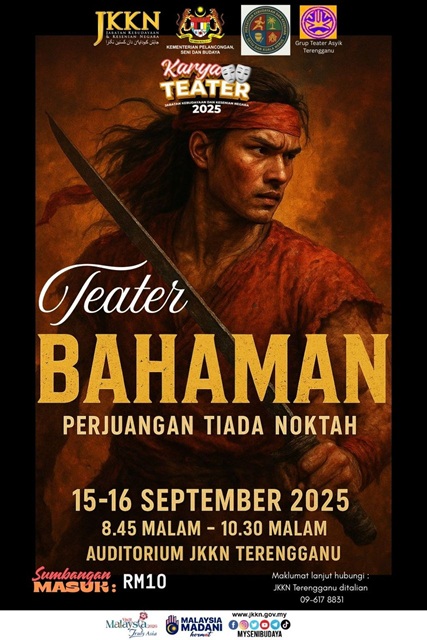 Pementasan Karya Teater Yang Dianjurkan oleh Jabatan Kebudayaan dan Kesenian Negara (JKKN) KUALA TERENGGANU, 10 Sept (Bernama) -- Jabatan Kebudayaan dan Kesenian Negara (JKKN) Terengganu dengan kerjasama Persatuan Kebudayaan dan Kesenian Setiu & Kuala Nerus serta Grup Teater Asyik (GTA) telah mementaskan sebuah karya teater berjudul BAHAMAN, sebuah kisah epik perjuangan pahlawan Melayu menentang penjajah demi maruah bangsa dan tanah air.