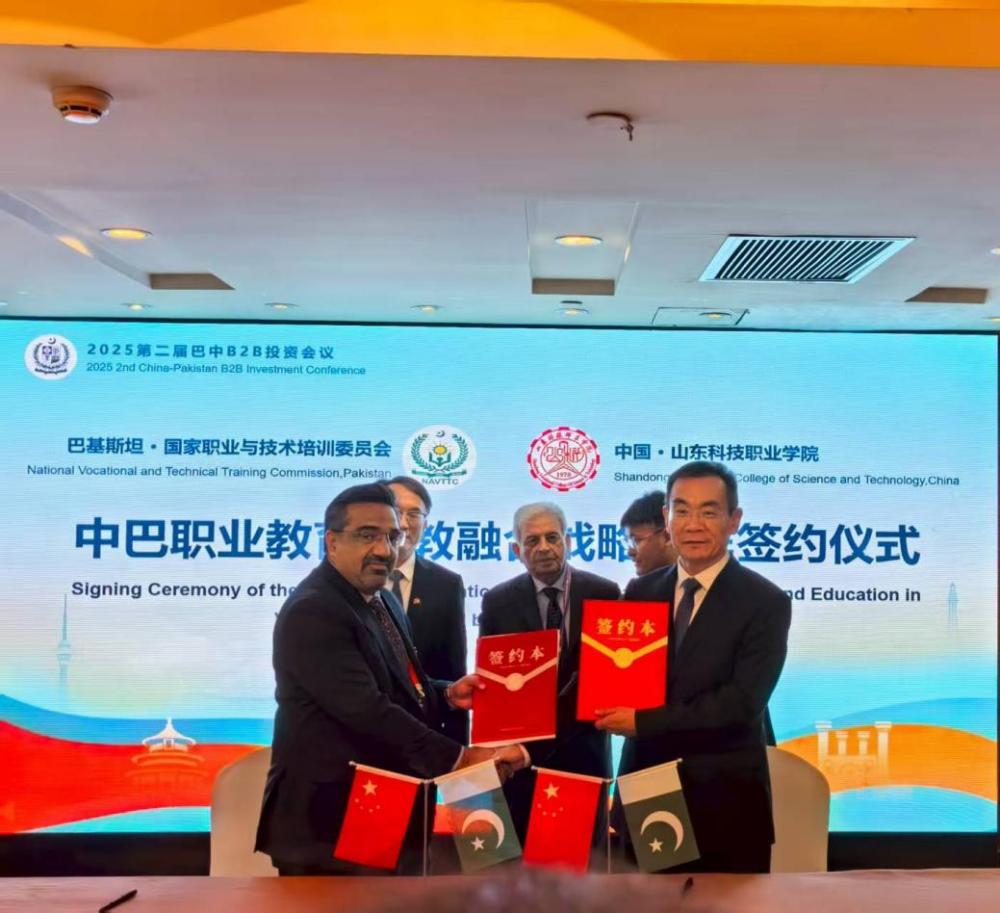 The 2nd Pakistan-China B2B Investment Conference & High-Level Symposium on China-Pakistan Industry-Education Integration in Vocational Education was held in Beijing. The conference was attended by Pakistani Prime Minister Shahbaz Sharif and Muhammad Aamir Jan, Executive Director of NAVTTC, Pakistan. Liu Fuyu, deputy party secretary and president of Shandong Vocational College of Science and Technology (SDVCST), was invited to attend on behalf of the college and officially signed a strategic cooperation agreement with NAVTTC.
