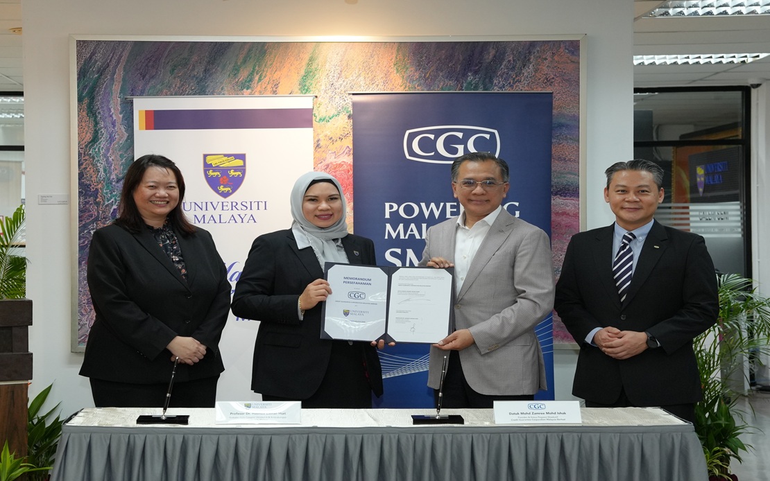 Presiden & Ketua Pegawai Eksekutif Credit Guarantee Corporation Malaysia Berhad (CGC), Datuk Mohd Zamree Mohd Ishak (dua dari kanan) dan Timbalan Naib Canselor (Akademik & Antarabangsa) Universiti Malaya, Profesor Dr. Hasniza Zaman Huri (dua dari kiri) pada majlis menandatangani Memorandum Persefahaman (MoU) antara UM dan CGC, disaksikan oleh Ketua Pegawai Perniagaan CGC, Sean Tan (kanan) serta Ir. Dr. Teoh Wen Hui (kiri), Yang Menjalankan Fungsi Pengarah Eksekutif Pusat Pendidikan Berterusan Universiti Malaya (UMCCed). Kerjasama ini akan memperkukuh keupayaan dan memacu pertumbuhan mampan bagi PMKS Malaysia di bawah CGC Developmental Programme®.