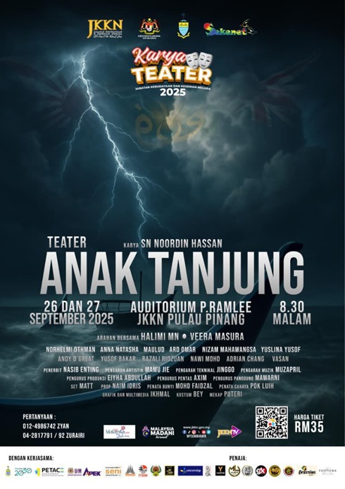 Pementasan Karya Teater 'Anak Tanjung' yang dianjurkan oleh Jabatan Kebudayaan dan Kesenian Negara (JKKN)GEORGETOWN, 22 Sept (Bernama) -- Kementerian Pelancongan, Seni dan Budaya (MOTAC) melalui Jabatan Kebudayaan dan Kesenian Negara (JKKN) Pulau Pinang dan Persatuan Seni Kreatif Budaya Warisan Estetik Pulau Pinang (Sekenet) telah menganjurkan Pementasan Karya Teater “Anak Tanjung” karya Sasterawan Negara Dato’ Dr. Noordin Hassan bermula pada 26 dan 27 September 2025 bertempat di Auditorium P.Ramlee JKKN Pulau Pinang.