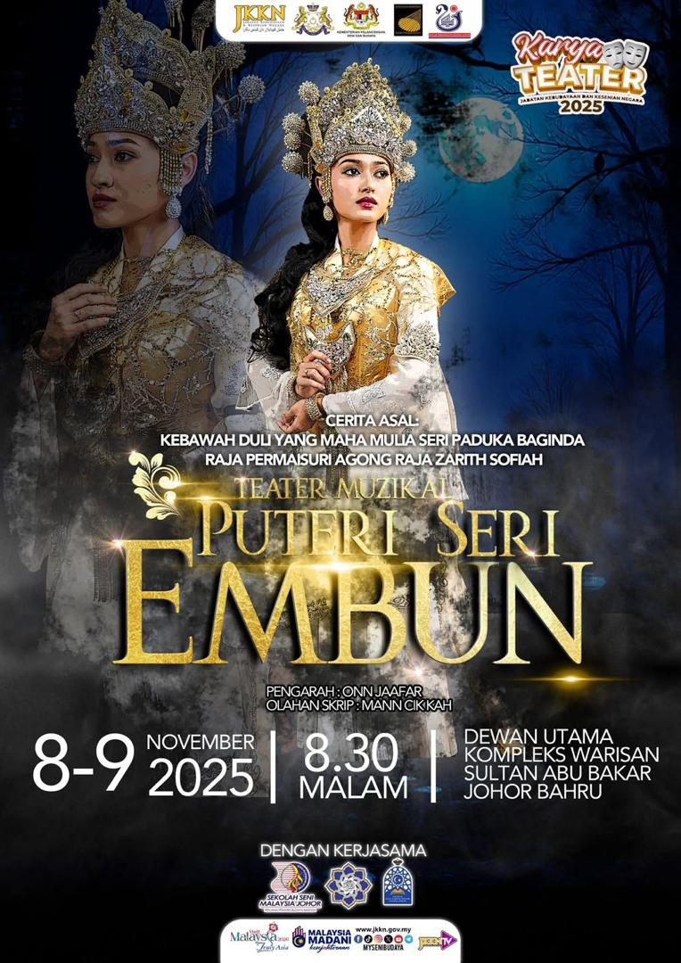 JOHOR BAHRU, 7 Nov (Bernama) -- Pementasan Teater Muzikal Puteri Seri Embun merupakan anjuran bersama Jabatan Kebudayaan dan Kesenian Negara, Johor (JKKN Johor) dengan Majlis Kebudayaan Negeri Johor (MKNJ), dikelolaan Majlis Teater Negeri Johor (MTNJ) dengan sokongan Yayasan Warisan Johor (YWJ), Yayasan Raja Zarith Sofiah Negeri Johor dan Sekolah Seni Malaysia Johor. Program ini turut mendapat penajaan daripada Sinar Bakery dan Active One.