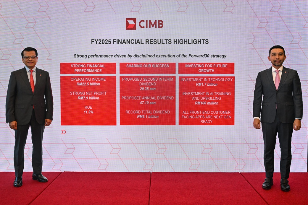 Declares record dividend payout of 47.1 sen or RM5.1 billionKUALA LUMPUR, March 2 (Bernama) -- CIMB Group Holdings Berhad (“CIMB Group” or “the Group”) achieved another year of strong financial performance with net profit of RM7.9 billion, up 1.7% for the financial year ended 31 December 2025 (“FY25”), compared to RM7.7 billion in the preceding year. Profit before tax (“PBT”) increased 2.7% YoY to RM10.7 billion, translating to earnings per share (“EPS”) of 73.1 sen. The results led to an improvement in annualised return on average equity (“ROE”) of 11.3%, up 10bps YoY, driven by disciplined execution of the Group’s Forward30 (“F30”) strategy, notwithstanding macroeconomic headwinds and persistent rate cuts during the year.