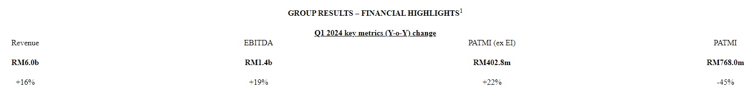 - The lower headline PATMI was primarily due to the high base in Q1 2023, which recorded one-off gains of RM862.0 million from the sale of International Medical University (“IMU”).